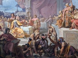Mint egész életét, úgy Attila halált is több, különféle legenda övezi. Paczka Ferenc 1884-ben erről festet képe nagy feltűnést keltett, de nem az uralkodó naturalista módon festett holtteste, hanem a főszereplővé tett Ildikó szexualizált bemutatása miatt. Ma pontosan látjuk, a festő csalt: a képen olyan részletek szerepelnek, amik nem léteztek Attila korában. A kiállítás rendezői itt is gondoskodtak arról, hogy a képet nézve, bal oldalon a falon, illetve mellette egy tárlóban sorakozzanak a bizonyítékok. Az ágynál álló háromlábnak támasztva hever egy bárd. A szomszédos vitrinben is ott van, a XIX. század eleji perzsa dervis bárd. Nem hun, nem ókori. A falon ugyancsak egy XIX. századi szőttesminta látható, pont olyan mintákkal, mint a képen, az Attila ágya melletti kárpiton. Sok ilyen érdekes ismerettel gazdagodhat, aki július 12-ig felkeresi a Nemzeti Múzeum valóban párját rikító legújabb kiállítását.