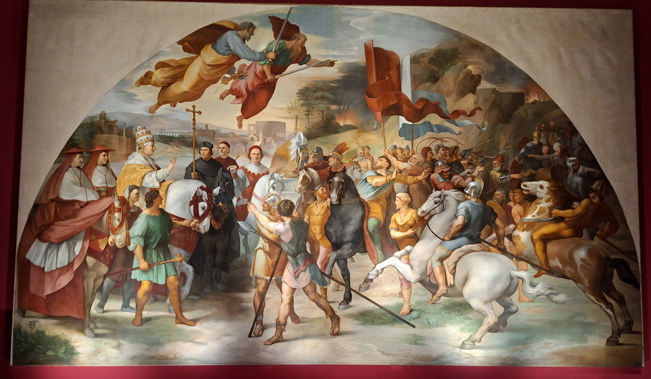 Százhúsz év után most először láthatja a hazai és a nemzetközi közönség ezt a képet, de sokkal közelebbről, mint a Vatikánban. Tehát jobban meg lehet vizsgálni. Jó egy évnyi komoly restaurátori munka eredménye, műszeres méréseket is végeztek, mivel hosszú évtizedeken keresztül fel volt tekerve. Most szinte teljesen újszerű állapotban látható. Persze érdemes a történeti pillanatot is elképzelni, vagy legalábbis picit elemezni. Raffaello a szereplőket – Attilát tévesen, pikkelypáncélt viselve – a festés korának megfelelő ruhában ábrázolta. Ezért raktak a rendezők most a kép mellé egy egészen máskor keletkezett szarmata páncélt. Akkoriban ebbe a viseletbe képzelték. Hasonló eltéréseket látni a kiállítás számos más pontján. Hogy amikor előkerülnek leletek a régi korokból, akkor azokat felhasználva helyezik bele az ismert szereplőket a régi időszakba. Mindez megmutatkozik egy másik, ugyancsak híres képen.