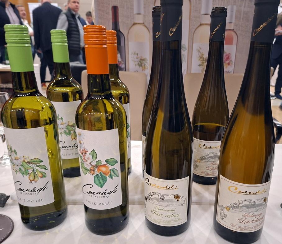 Csanádi Csanádtól családi titkokat is megtudtunk. Elmondta: szinte az anyatejjel szívtam magamba a szőlő szeretetét. Dédapám az Esterházy-birtokon volt vincellér, apai ágon pedig a Purvi család birtokán szolgáltak felmenőim. Innen örökölte nagypapám is a hivatást, ő a Badacsonyi Állami Gazdaság főborásza volt. Édesapám, Csanádi József is ezt az utat választotta. A családban a szőlő és a bor szeretete generációról generációra száll. Erre a bemutatóra elsősorban az Olaszrizlinggel és a Szürkebaráttal készültem. Jelenleg 10 hektáron gazdálkodunk, a dűlőink Badacsonytomaj területén és még négy másik-hegyen találhatók. Hoztunk egy üde, reduktív technológiával készült Olaszrizlinget, amely elegáns és illatos, de megőrzi a badacsonyi karaktert. Emellett bemutatunk egy dűlőszelektált tételt is, amely a hagyományoknak megfelelően 300 literes, enyhén pörkölt, új zempléni tölgyfából készült barrique hordóban érlelődött két hónapot. A hordó még selymesebbé és karakteresebbé tette a minerális ízeket. A Szürkebarát (Pinot Gris) Badacsonyban szinte második hazájára talált. A szőlőbogyó héja rózsaszínes-barnás, és mivel a szín- és illatanyagok a héjban raktározódnak, egy rövid cefrézés után ez a szín megjelenik a borban is. A hordós, barrikolt tételnél a tónus még mélyebb, már-már rózsaszínes-sárgába hajlik. A Kéknyelű egy különleges, nővirágú szőlőfajta. Ahhoz, hogy megtermékenyüljön, egy másik fajtára (például Budai zöldre vagy Rózsakőre) van szükség mellé a beporzáshoz. A virágzása június első felére esik, amit a borvidéken külön ünneppel is megtisztelünk. Borának színe tiszta fehér, illatában azonnal érezni a badacsonyi mikroklíma és az „ázott bazalt” jellegzetes, vulkanikus, minerális jegyeit. Ízét markáns savszerkezet és erős vulkanikus zamatok jellemzik, ami igazán egyedivé teszi.