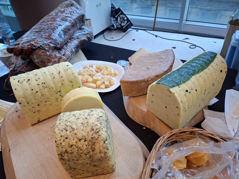 Ennyi bor kóstolása esetén kell, hogy valami borhoz illő harapnivaló is helyet kapjon a kínálatban. Meg is jelent különleges választékával a Lesencei Szegi Sajt, Tapolca mellől, Lesencetomajról. A családi gazdaság szarvasmarhatartással, borjúneveléssel foglalkozik. A tejből sajtot készítenek, és megpróbálják a badacsonyi borászatokkal, éttermekkel együttműködve értékesíteni. Most hétféle sajtot hoztak, az egyik legérdekesebb a szezonális, medvehagymás sajt. A medvehagyma a saját területükön terem, frissen szedik. Az előző napi készítésű sajtba szeletelik bele, és egy kicsit érlelik vele. A másik a 14 hónapos sajt, szintén tehéntejből készül, és pincében érlelték 14 hónapon keresztül. Közben két-három naponta kenegetik sós oldattal, amitől megkérgesedik. Akár két évig is eltartható, fogyasztható – de akkor már inkább parmezán jellegű, reszelhető állagba megy át. A sajt mellé kínált kolbászhoz maguk nevelik a sertést, ám a kolbászhúshoz 30% arányban kevernek marhahúst is. Az ízét paprika, bors kömény adja és bükkfával füstölik.